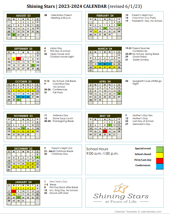 Shining Stars Learning Center 2023-2024 Calendar (pdf)